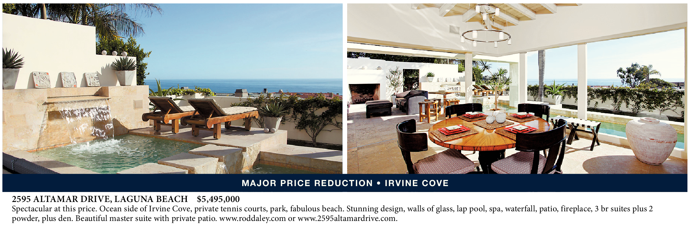 2595 ALTAMAR DRIVE, LAGUNA BEACH $5,495,000 Spectacular at this price. Ocean side of Irvine Cove, private tennis courts, park, fabulous beach. Stunning design, walls of glass, lap pool, spa, waterfall, patio, fireplace, 3 br suites plus 2 powder, plus den. Beautiful master suite with private patio. www.roddaley.com or www.2595altamardrive.com. MAJOR PRICE REDUCTION • IRVINE COVE
