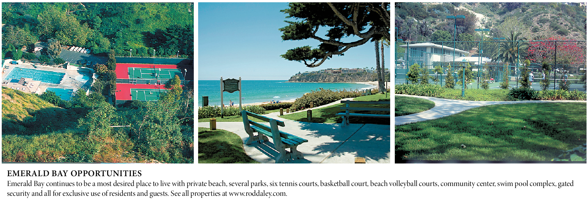 EMERALD BAY OPPORTUNITIES Emerald Bay continues to be a most desired place to live with private beach, several parks, six tennis courts, basketball court, beach volleyball courts, community center, swim pool complex, gated security and all for exclusive use of residents and guests. See all properties at www.roddaley.com.