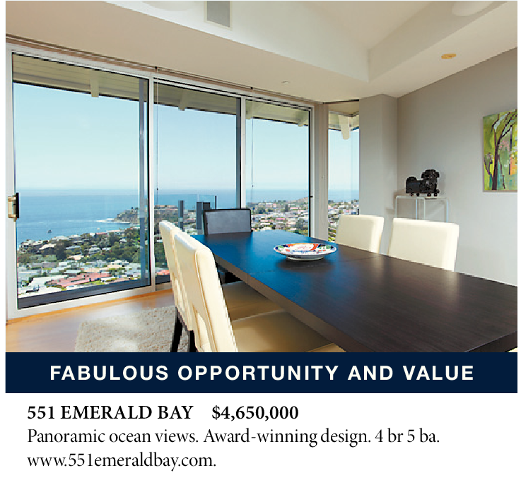 551 EMERALD BAY $4,650,000 Panoramic ocean views. Award-winning design. 4 br 5 ba. www.551emeraldbay.com.