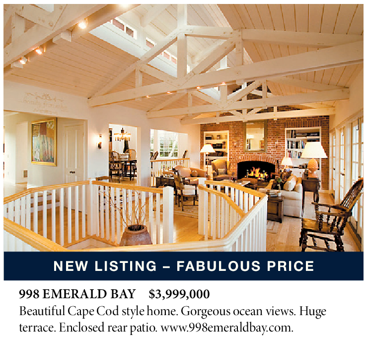 998 EMERALD BAY $3,999,000 Beautiful Cape Cod style home. Gorgeous ocean views. Huge terrace. Enclosed rear patio. www.998emeraldbay.com.