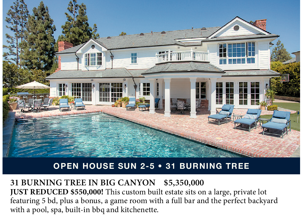 31 BURNING TREE IN BIG CANYON $5,350,000 JUST REDUCED $550,000! This custom built estate sits on a large, private lot featuring 5 bd, plus a bonus, a game room with a full bar and the perfect backyard with a pool, spa, built-in bbq and kitchenette.