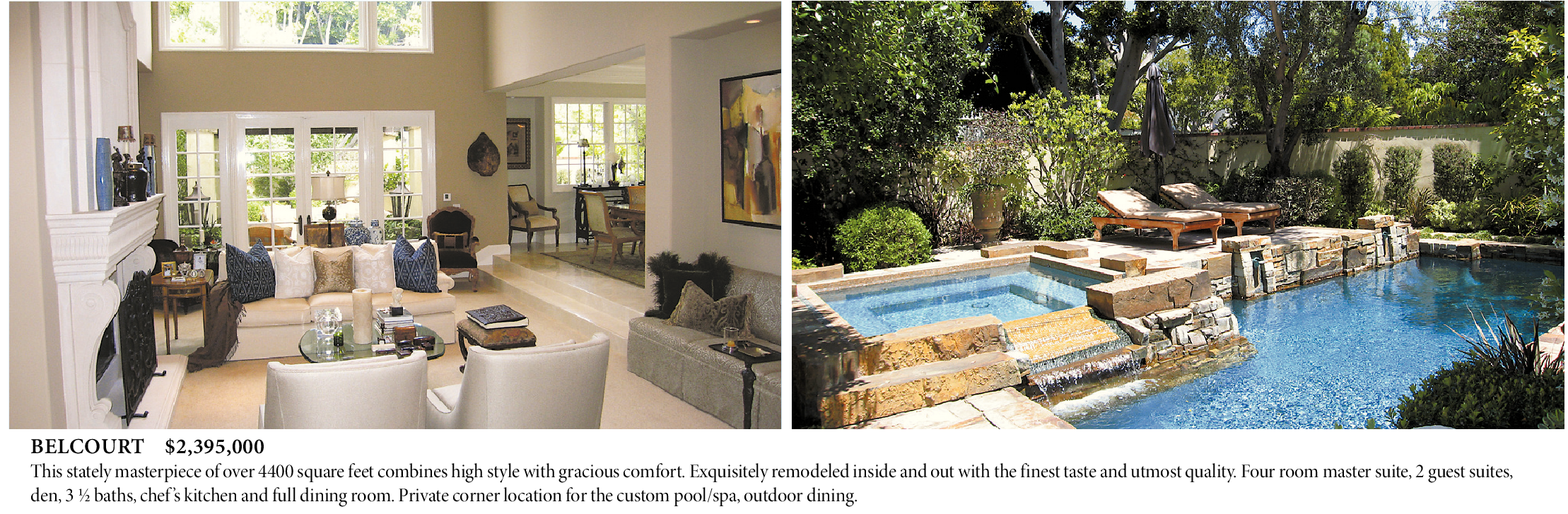 BELCOURT $2,395,000 This stately masterpiece of over 4400 square feet combines high style with gracious comfort. Exquisitely remodeled inside and out with the finest taste and utmost quality. Four room master suite, 2 guest suites, den, 3 ½ baths, chef ’s kitchen and full dining room. Private corner location for the custom pool/spa, outdoor dining.