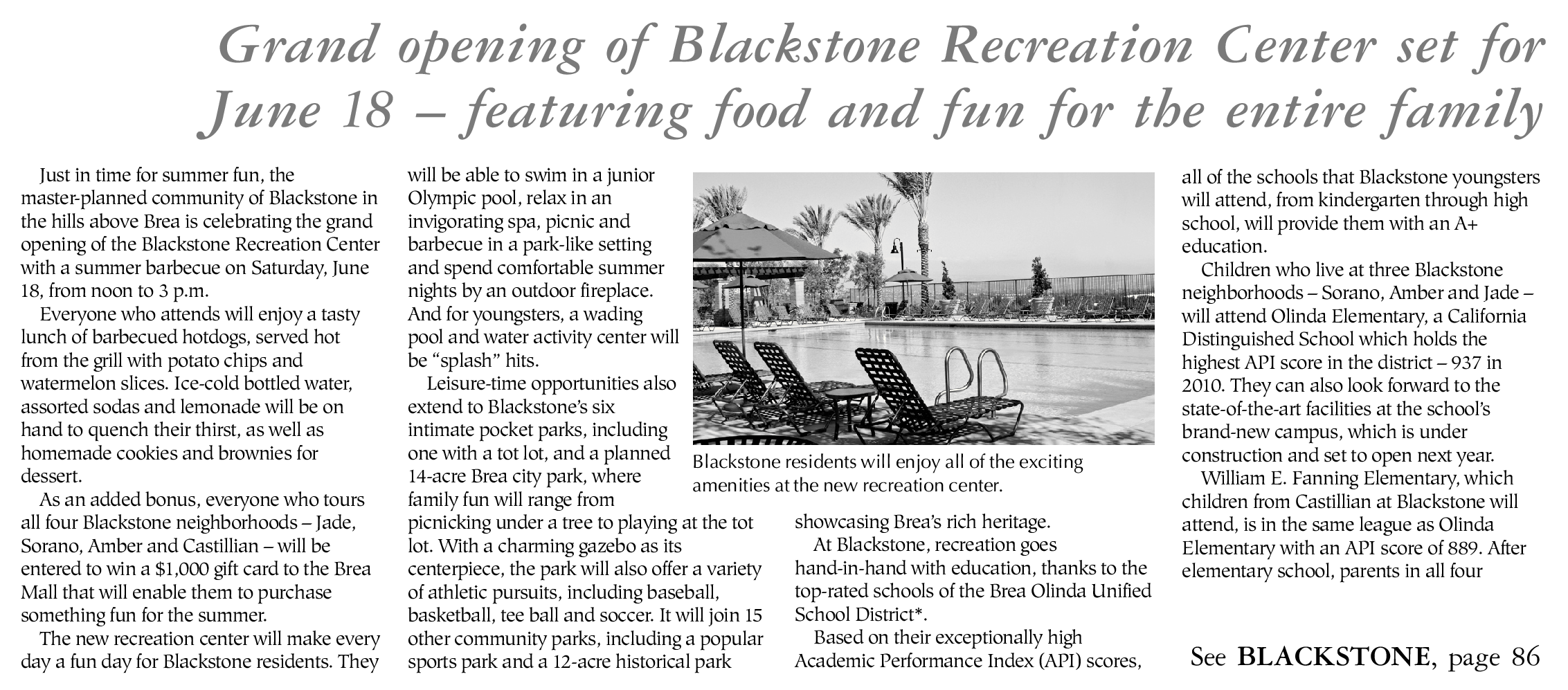 Just in time for summer fun, the master-planned community of Blackstone in the hills above Brea is celebrating the grand opening of the Blackstone Recreation Center with a summer barbecue on Saturday, June 18, from noon to 3 p.m.
