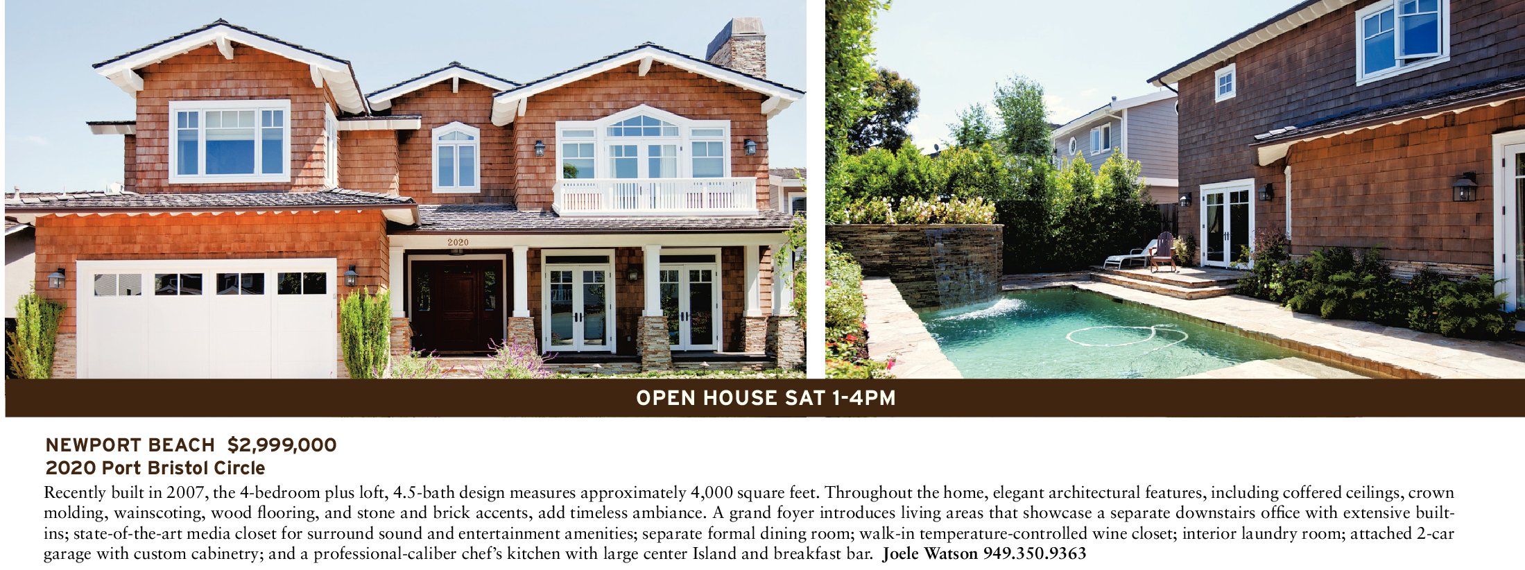 OPEN HOUSE SAT 1-4PM NEWPORT BEACH $2,999,000 2020 Port Bristol Circle Recently built in 2007, the 4-bedroom plus loft, 4.5-bath design measures approximately 4,000 square feet. Throughout the home, elegant architectural features, including coffered ceilings, crown molding, wainscoting, wood flooring, and stone and brick accents, add timeless ambiance. A grand foyer introduces living areas that showcase a separate downstairs office with extensive builtins; state-of-the-art media closet for surround sound and entertainment amenities; separate formal dining room; walk-in temperature-controlled wine closet; interior laundry room; attached 2-car garage with custom cabinetry; and a professional-caliber chef’s kitchen with large center Island and breakfast bar. Joele Watson 949.350.9363