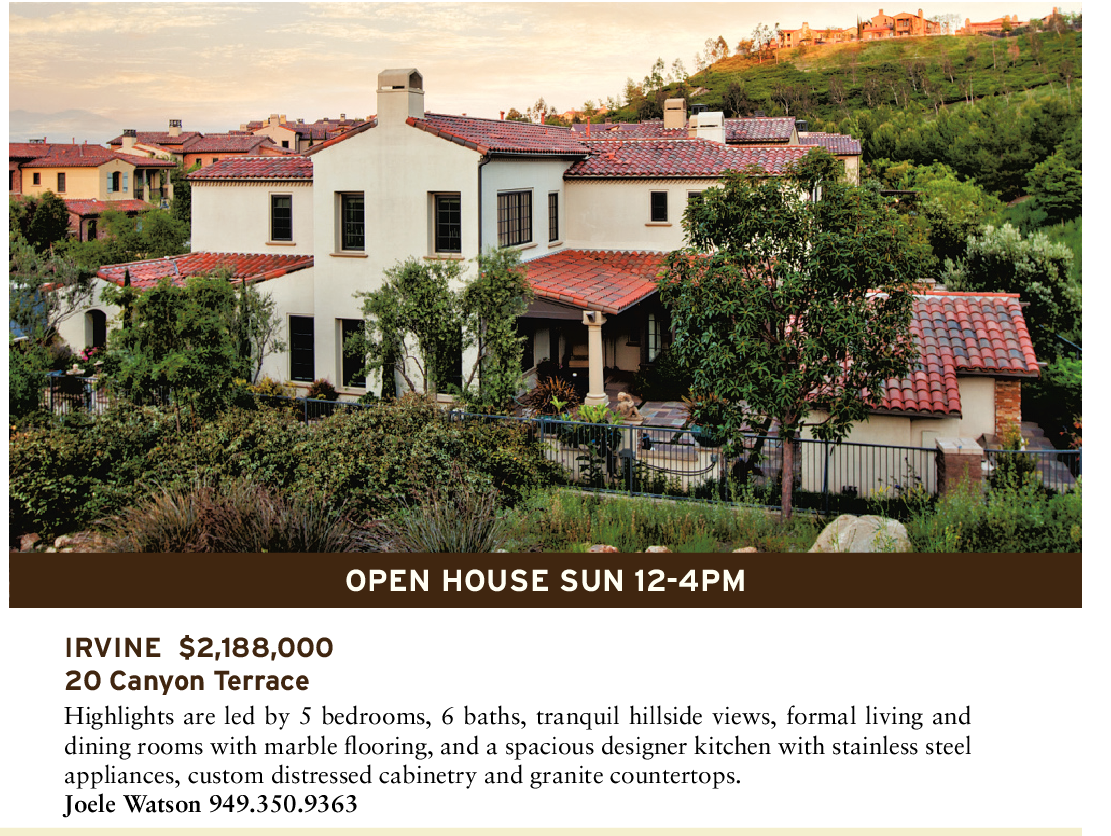 IRVINE $2,188,000 20 Canyon Terrace Highlights are led by 5 bedrooms, 6 baths, tranquil hillside views, formal living and dining rooms with marble flooring, and a spacious designer kitchen with stainless steel appliances, custom distressed cabinetry and granite countertops. Joele Watson 949.350.9363