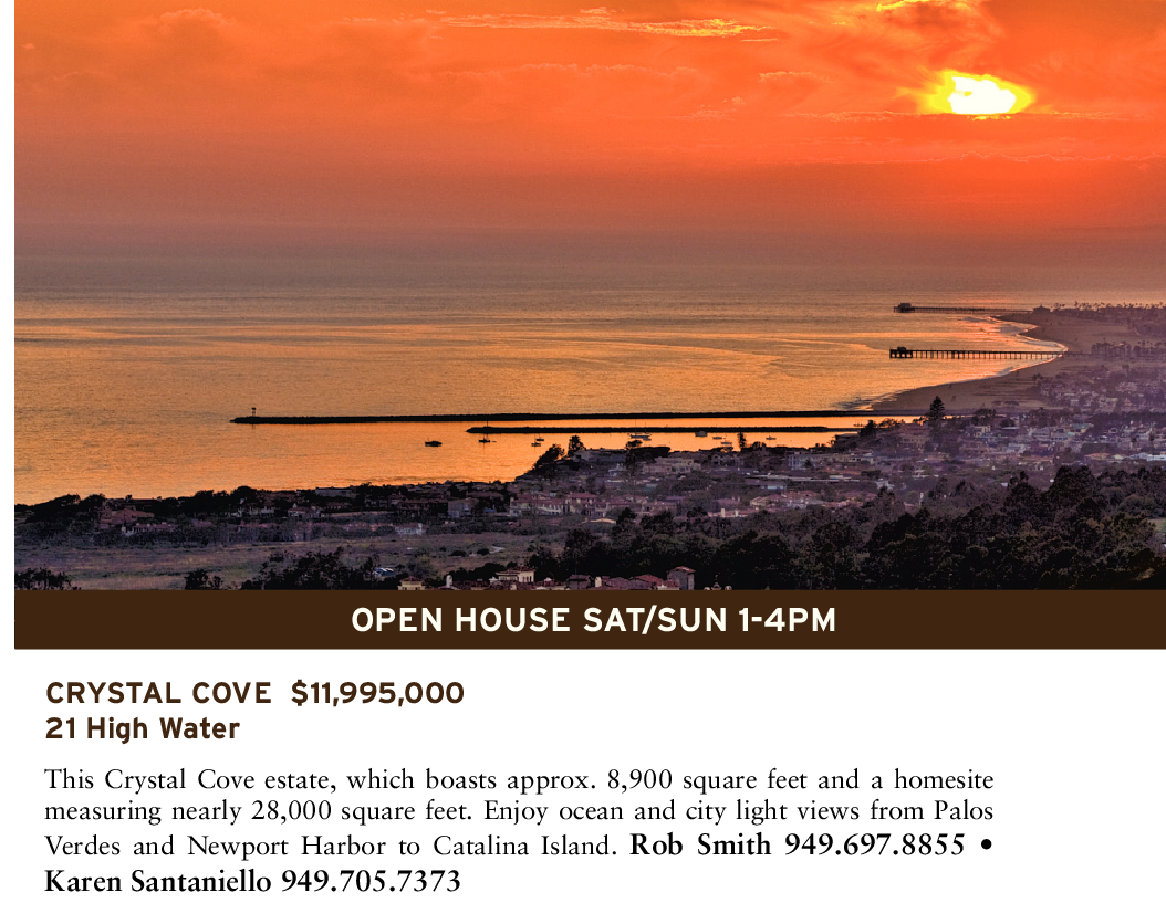 CRYSTAL COVE $11,995,000 21 High Water OPEN HOUSE SAT/SUN 1-4PM This Crystal Cove estate, which boasts approx. 8,900 square feet and a homesite measuring nearly 28,000 square feet. Enjoy ocean and city light views from Palos Verdes and Newport Harbor to Catalina Island. Rob Smith 949.697.8855 • Karen Santaniello 949.705.7373
