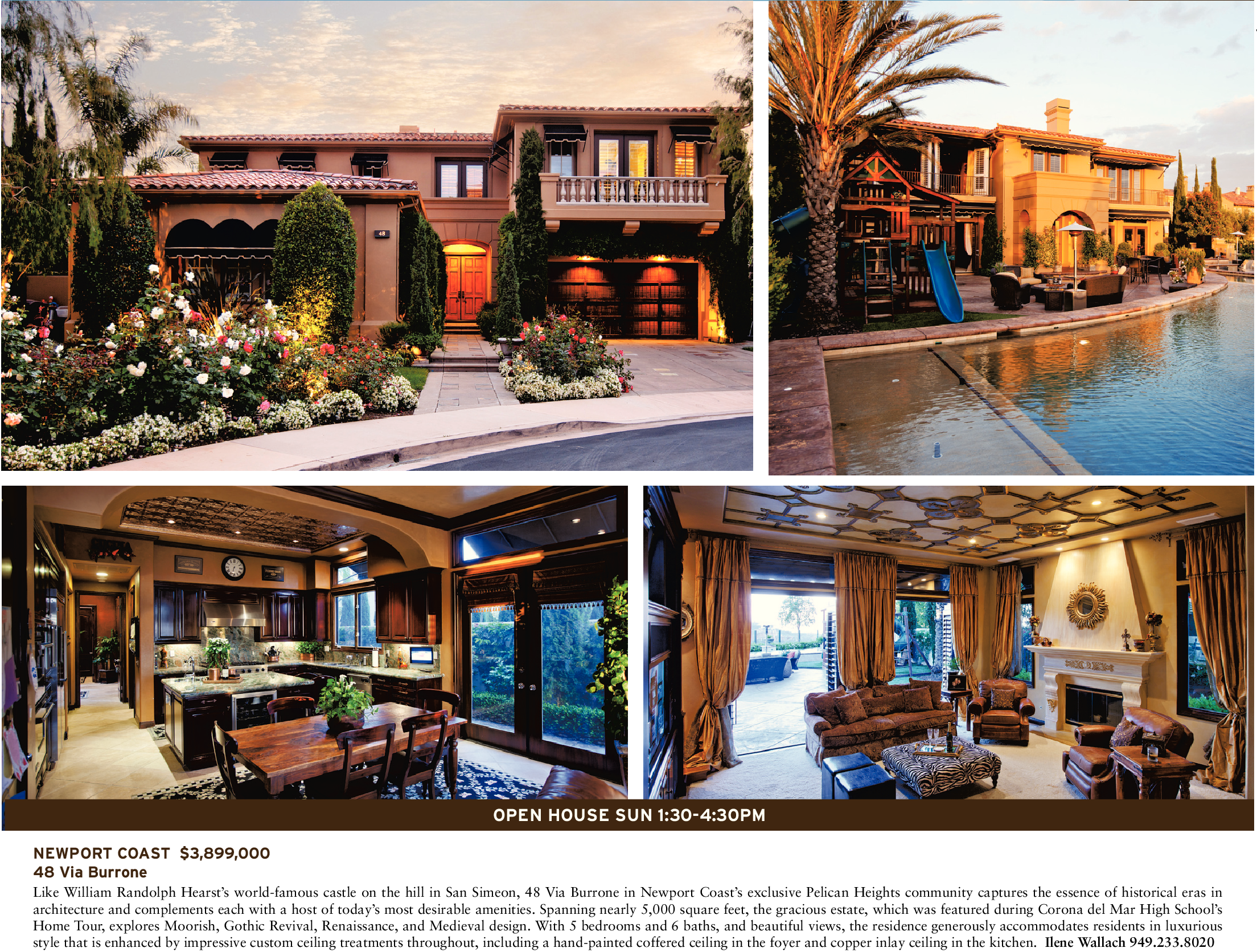 NEWPORT COAST $3,899,000 48 Via Burrone Like William Randolph Hearst’s world-famous castle on the hill in San Simeon, 48 Via Burrone in Newport Coast’s exclusive Pelican Heights community captures the essence of historical eras in architecture and complements each with a host of today’s most desirable amenities. Spanning nearly 5,000 square feet, the gracious estate, which was featured during Corona del Mar High School’s Home Tour, explores Moorish, Gothic Revival, Renaissance, and Medieval design. With 5 bedrooms and 6 baths, and beautiful views, the residence generously accommodates residents in luxurious style that is enhanced by impressive custom ceiling treatments throughout, including a hand-painted coffered ceiling in the foyer and copper inlay ceiling in the kitchen. Ilene Wallach 949.233.8020