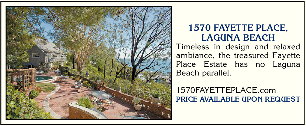 1570 FAYETTE PLACE, LAGUNA BEACH Timeless in design and relaxed ambiance, the treasured Fayette Place Estate has no Laguna Beach parallel.