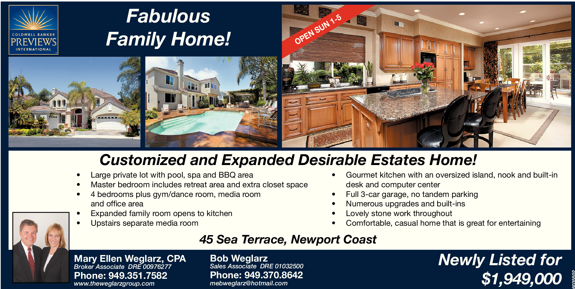 Fabulous Family Home! Customized and Expanded Desirable Estates Home! • Large private lot with pool, spa and BBQ area • Master bedroom includes retreat area and extra closet space • 4 bedrooms plus gym/dance room, media room and office area • Expanded family room opens to kitchen • Upstairs separate media room Mary Ellen Weglarz, CPA Broker Associate DRE 00976277 Phone: 949.351.7582 www.theweglarzgroup.com 45 Sea Terrace, Newport Coast Bob Weglarz Sales Associate DRE 01032500 Phone: 949.370.8642 mebweglarz@hotmail.com • Gourmet kitchen with an oversized island, nook and built-in desk and computer center • Full 3-car garage, no tandem parking • Numerous upgrades and built-ins • Lovely stone work throughout • Comfortable, casual home that is great for entertaining Newly Listed for $1,949,000