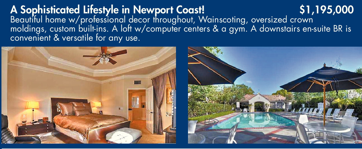A Sophisticated Lifestyle in Newport Coast! $1,195,000 Beautiful home w/professional decor throughout, Wainscoting, oversized crown moldings, custom built-ins. A loft w/computer centers & a gym. A downstairs en-suite BR is convenient & versatile for any use.