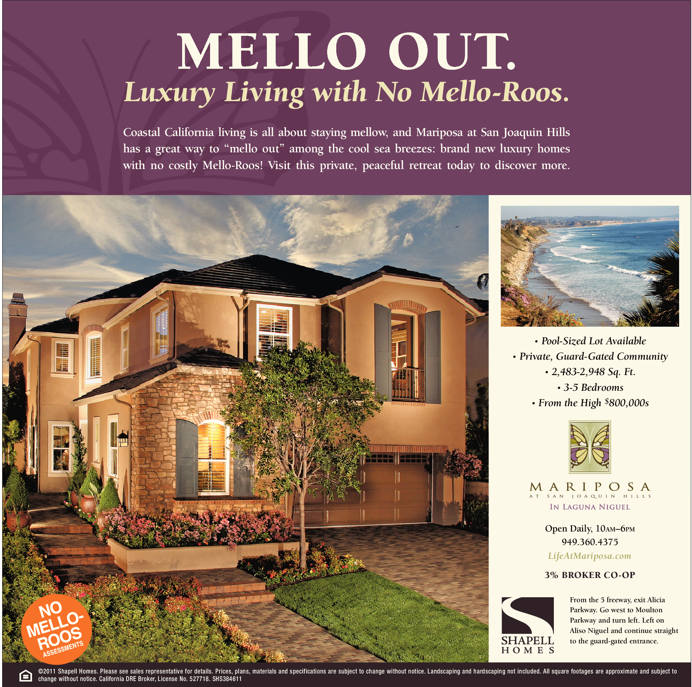M E L L O O U T. Luxury Living with No Mello-Roos. Coastal California living is all about staying mellow, and Mariposa at San Joaquin Hills has a great way to “mello out” among the cool sea breezes: brand new luxury homes with no costly Mello-Roos! Visit this private, peaceful retreat today to discover more. • Pool-Sized Lot Available • Private, Guard-Gated Community • 2,483-2,948 Sq. Ft. • 3-5 Bedrooms • From the High $800,000s Open Daily, 10AM–6PM 949.360.4375 LifeAtMariposa.com 3% BROKER CO-OP From the 5 freeway, exit Alicia Parkway. Go west to Moulton Parkway and turn left. Left on Aliso Niguel and continue straight to the guard-gated entrance. ©2011 Shapell Homes. Please see sales representative for details. Prices, plans, materials and specifications are subject to change without notice. Landscaping and hardscaping not included. All square footages are approximate and subject to change without notice. California DRE Broker, License No. 527718. SHS384611