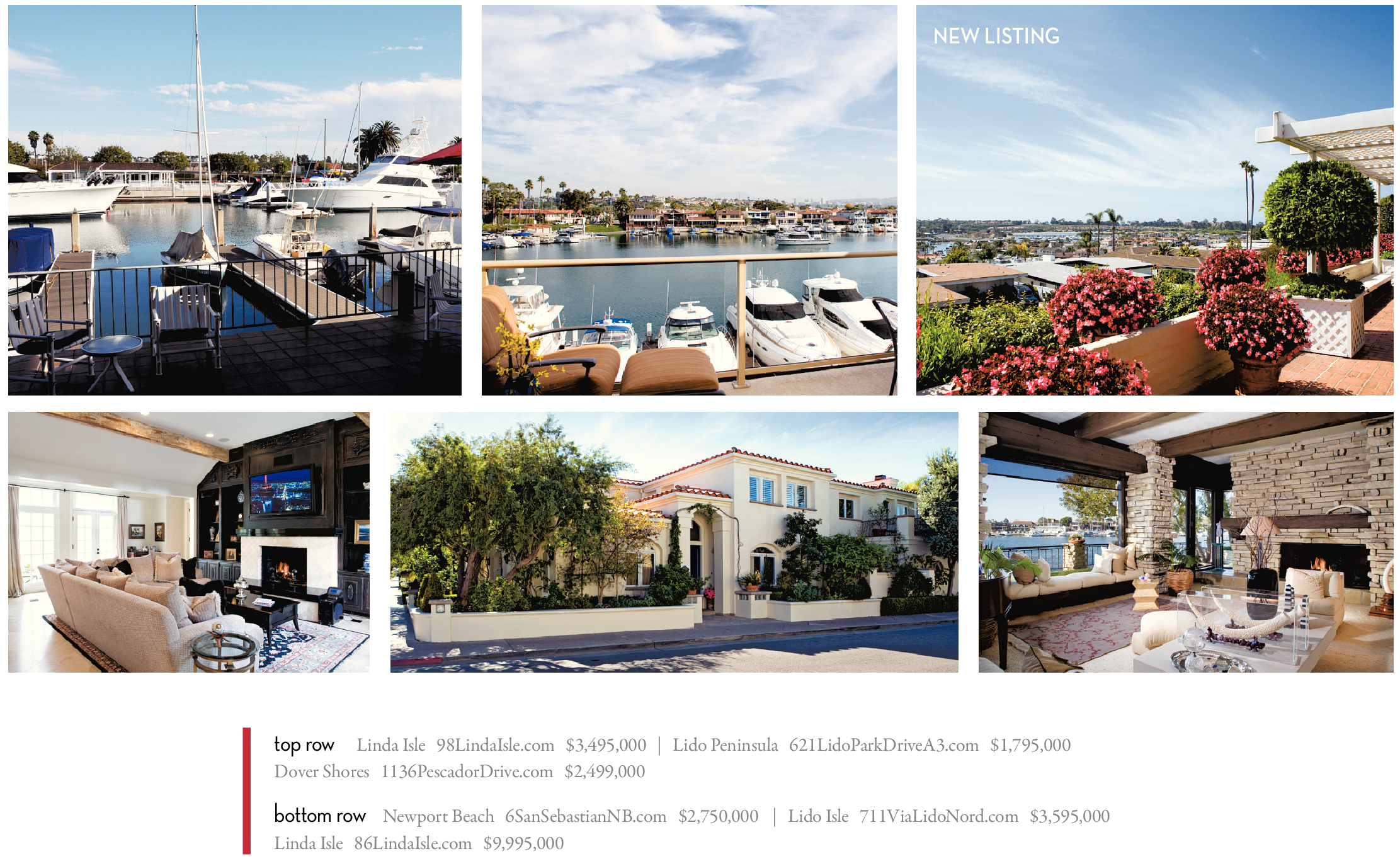 NEW LISTING top row Linda Isle 98LindaIsle.com $3,495,000 | Lido Peninsula 621LidoParkDriveA3.com $1,795,000 Dover Shores 1136PescadorDrive.com $2,499,000 bottom row Newport Beach 6SanSebastianNB.com $2,750,000 | Lido Isle 711ViaLidoNord.com $3,595,000 Linda Isle 86LindaIsle.com $9,995,000 See also