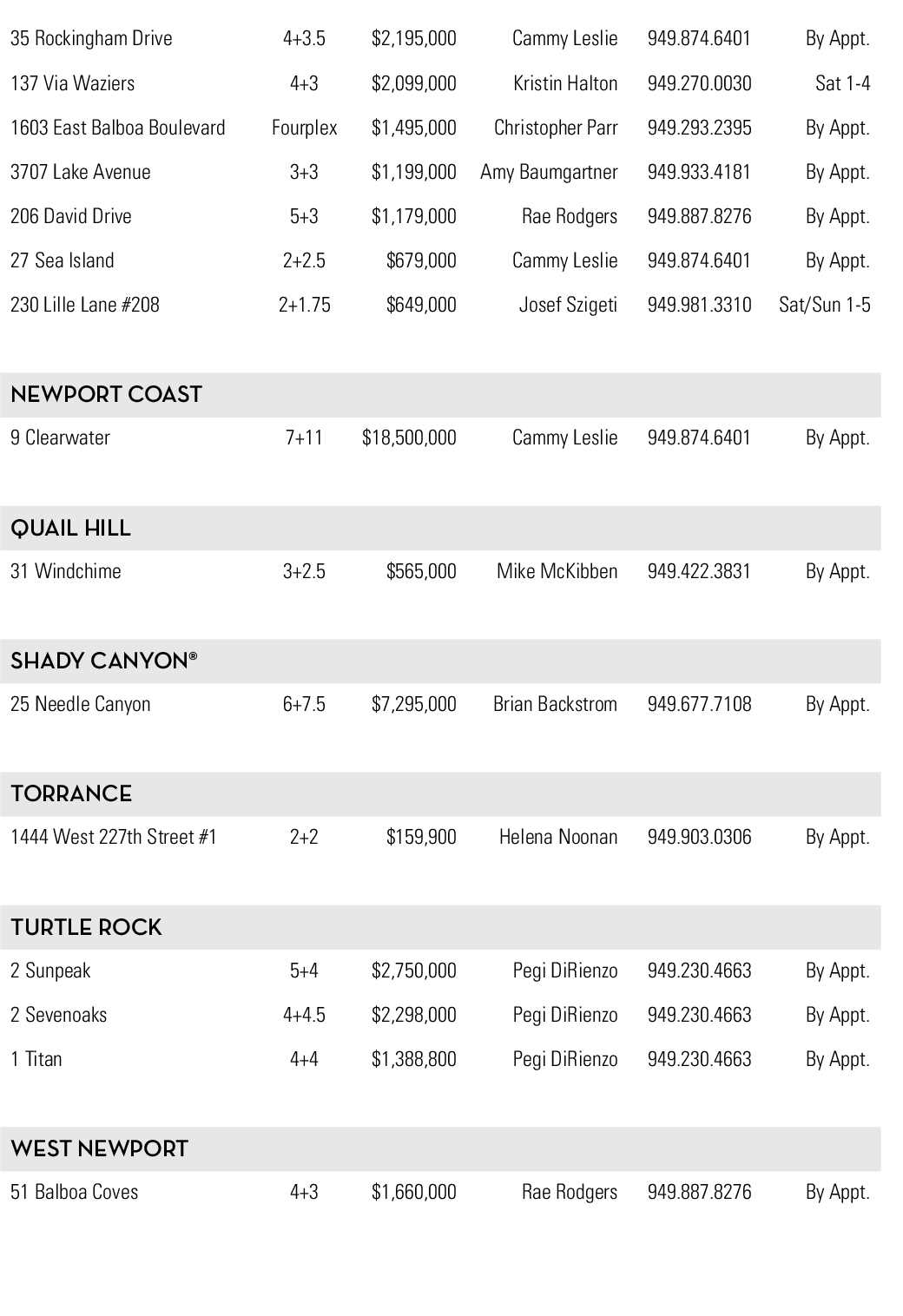 35 Rockingham Drive 4+3.5 $2,195,000 Cammy Leslie 949.874.6401 By Appt.