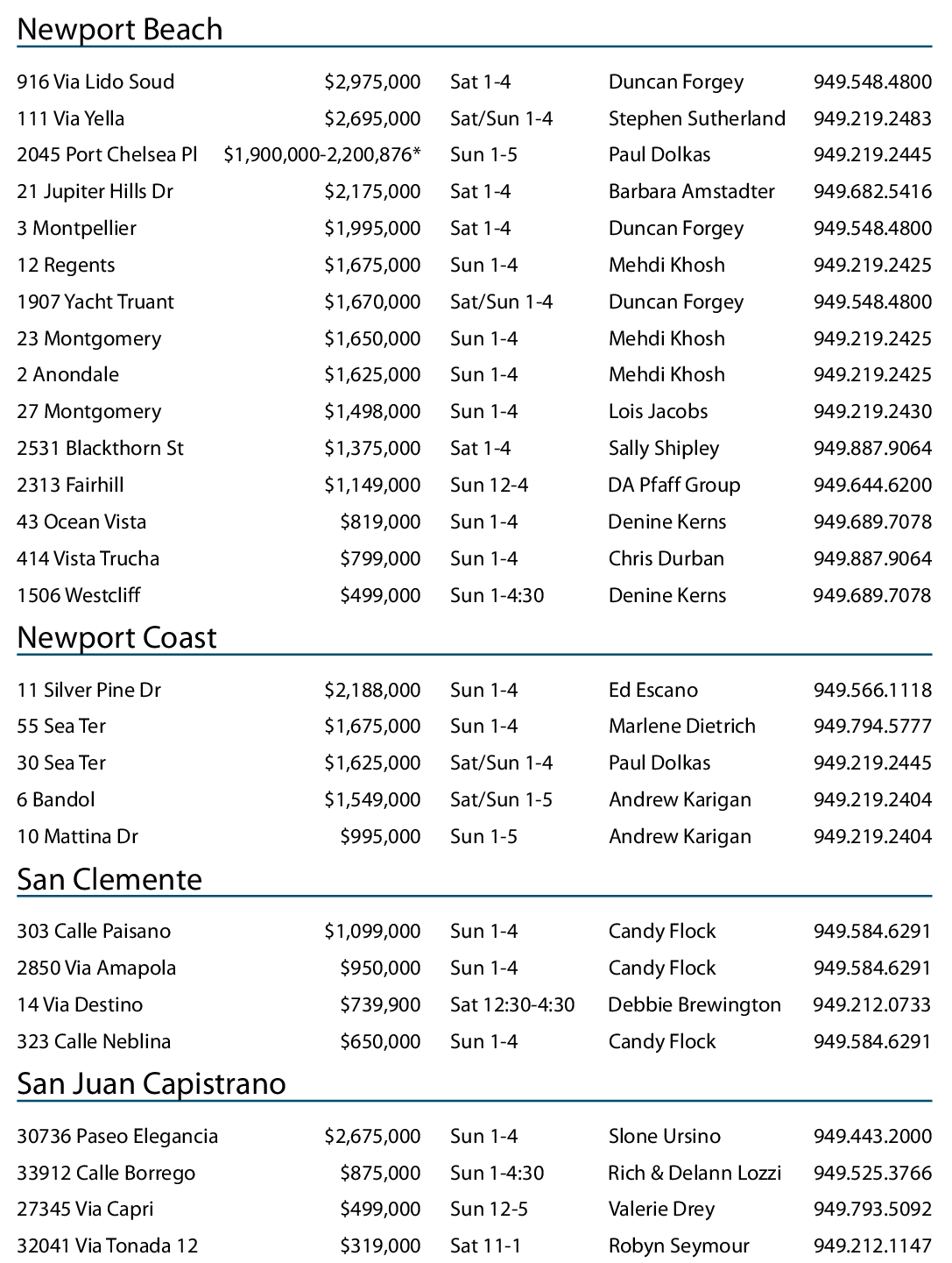 916 Via Lido Soud $2,975,000 Sat 1-4 Duncan Forgey 949.548.4800 111 Via Yella $2,695,000 Sat/Sun 1-4 Stephen Sutherland 949.219.2483 2045 Port Chelsea Pl $1,900,000-2,200,876* Sun 1-5 Paul Dolkas 949.219.2445 21 Jupiter Hills Dr $2,175,000 Sat 1-4 Barbara Amstadter 949.682.5416 3 Montpellier $1,995,000 Sat 1-4 Duncan Forgey 949.548.4800 12 Regents $1,675,000 Sun 1-4 Mehdi Khosh 949.219.2425 1907 Yacht Truant $1,670,000 Sat/Sun 1-4 Duncan Forgey 949.548.4800 23 Montgomery $1,650,000 Sun 1-4 Mehdi Khosh 949.219.2425 2 Anondale $1,625,000 Sun 1-4 Mehdi Khosh 949.219.2425 27 Montgomery $1,498,000 Sun 1-4 Lois Jacobs 949.219.2430 2531 Blackthorn St $1,375,000 Sat 1-4 Sally Shipley 949.887.9064 2313 Fairhill $1,149,000 Sun 12-4 DA Pfaff Group 949.644.6200 43 Ocean Vista $819,000 Sun 1-4 Denine Kerns 949.689.7078 414 Vista Trucha $799,000 Sun 1-4 Chris Durban 949.887.9064 1506 Westcliff $499,000 Sun 1-4:30 Denine Kerns 949.689.7078