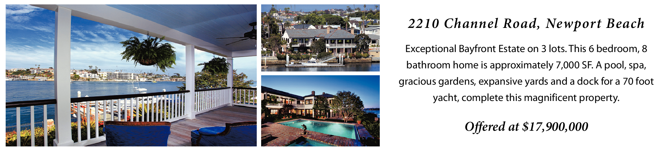 2210 Channel Road, Newport Beach Exceptional Bayfront Estate on 3 lots. This 6 bedroom, 8 bathroom home is approximately 7,000 SF. A pool, spa, gracious gardens, expansive yards and a dock for a 70 foot yacht, complete this magnificent property. Offered at $17,900,000