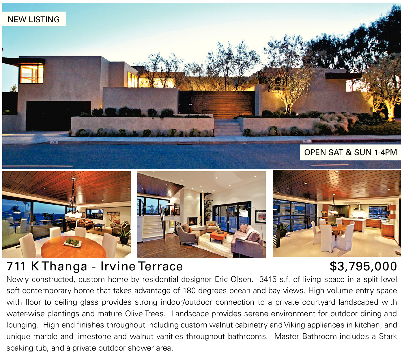 Newly constructed, custom home by residential designer Eric Olsen. 3415 s.f. of living space in a split level soft contemporary home that takes advantage of 180 degrees ocean and bay views. High volume entry space with floor to ceiling glass provides strong indoor/outdoor connection to a private courtyard landscaped with water-wise plantings and mature Olive Trees. Landscape provides serene environment for outdoor dining and lounging. High end finishes throughout including custom walnut cabinetry and Viking appliances in kitchen, and unique marble and limestone and walnut vanities throughout bathrooms. Master Bathroom includes a Stark soaking tub, and a private outdoor shower area.