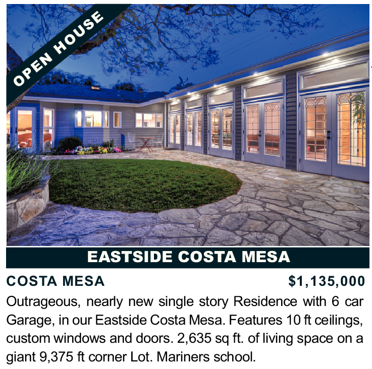 EASTSIDE COSTA MESA COSTA MESA $1,135,000 Outrageous, nearly new single story Residence with 6 car Garage, in our Eastside Costa Mesa. Features 10 ft ceilings, custom windows and doors. 2,635 sq ft. of living space on a giant 9,375 ft corner Lot. Mariners school.