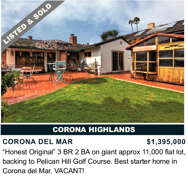 “Honest Original” 3 BR 2 BA on giant approx 11,000 flat lot, backing to Pelican Hill Golf Course. Best starter home in Corona del Mar. VACANT!