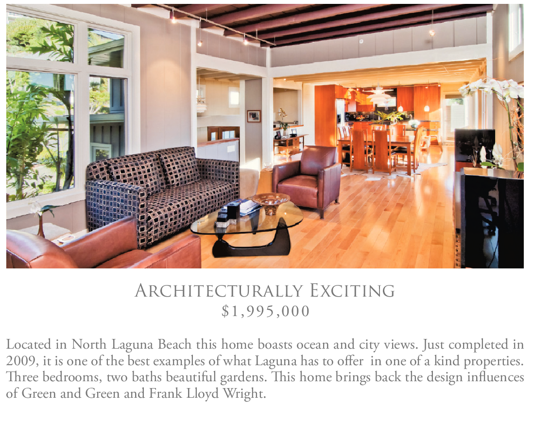 Architecturally Exciting $1,995,000 Located in North Laguna Beach this home boasts ocean and city views. Just completed in 2009, it is one of the best examples of what Laguna has to offer in one of a kind properties. Three bedrooms, two baths beautiful gardens. This home brings back the design influences of Green and Green and Frank Lloyd Wright.