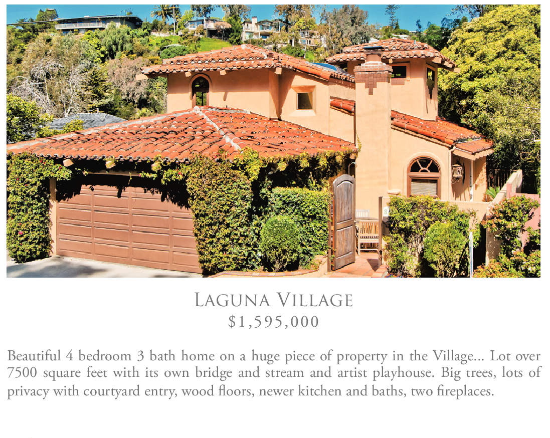 Laguna Village $1,595,000 Beautiful 4 bedroom 3 bath home on a huge piece of property in the Village... Lot over 7500 square feet with its own bridge and stream and artist playhouse. Big trees, lots of privacy with courtyard entry, wood floors, newer kitchen and baths, two fireplaces.