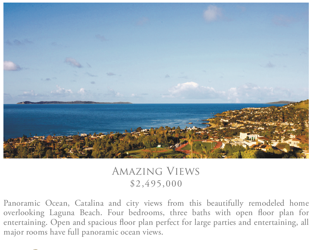 Amazing Views $2,495,000 Panoramic Ocean, Catalina and city views from this beautifully remodeled home overlooking Laguna Beach. Four bedrooms, three baths with open floor plan for entertaining. Open and spacious floor plan perfect for large parties and entertaining, all major rooms have full panoramic ocean views.