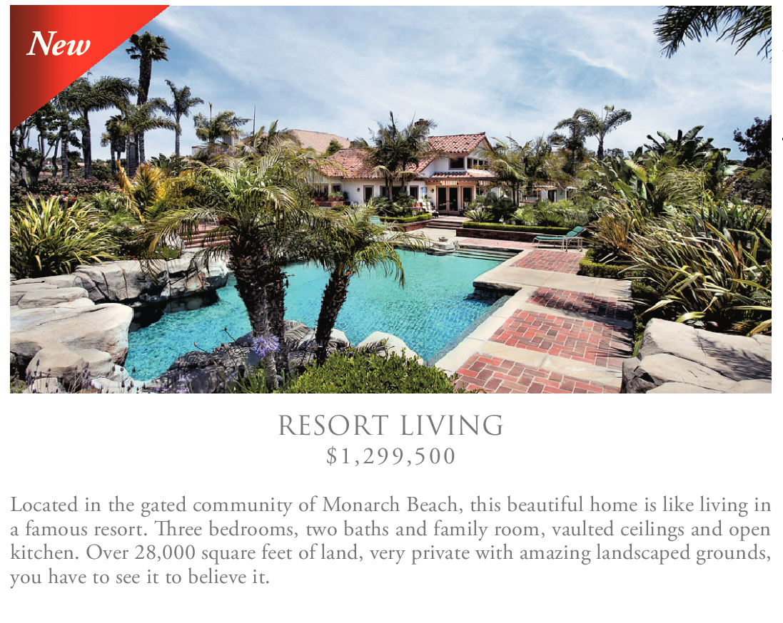 New RESORT LIVING $1,299,500 Located in the gated community of Monarch Beach, this beautiful home is like living in a famous resort. Three bedrooms, two baths and family room, vaulted ceilings and open kitchen. Over 28,000 square feet of land, very private with amazing landscaped grounds, you have to see it to believe it.