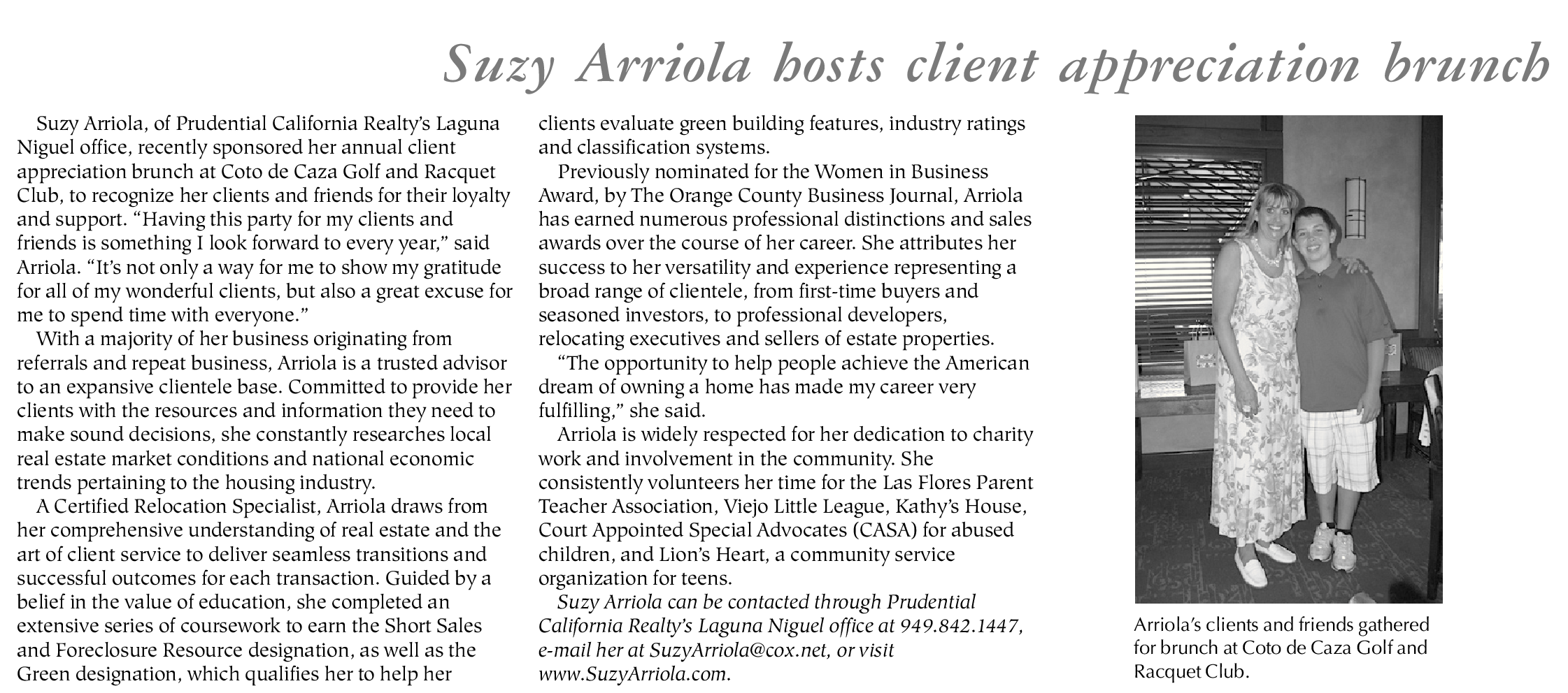 Suzy Arriola, of Prudential California Realty’s Laguna Niguel office, recently sponsored her annual client appreciation brunch at Coto de Caza Golf and Racquet Club, to recognize her clients and friends for their loyalty and support. “Having this party for my clients and friends is something I look forward to every year,” said Arriola. “It’s not only a way for me to show my gratitude for all of my wonderful clients, but also a great excuse for me to spend time with everyone.”