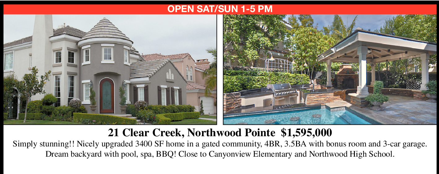 OPEN SAT/SUN 1-5 PM 21 Clear Creek, Northwood Pointe $1,595,000 Simply stunning!! Nicely upgraded 3400 SF home in a gated community, 4BR, 3.5BA with bonus room and 3-car garage. Dream backyard with pool, spa, BBQ! Close to Canyonview Elementary and Northwood High School.