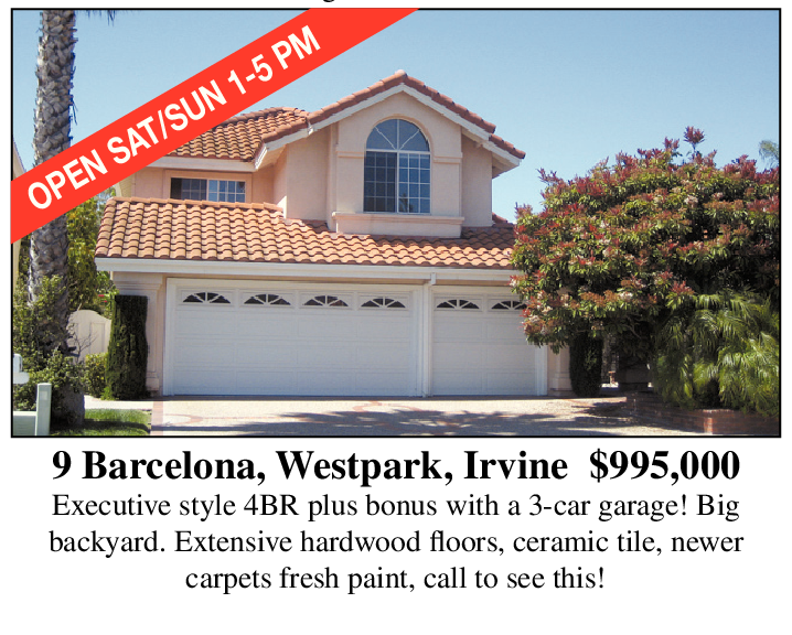 9 Barcelona, Westpark, Irvine $995,000 Executive style 4BR plus bonus with a 3-car garage! Big backyard. Extensive hardwood floors, ceramic tile, newer carpets fresh paint, call to see this!