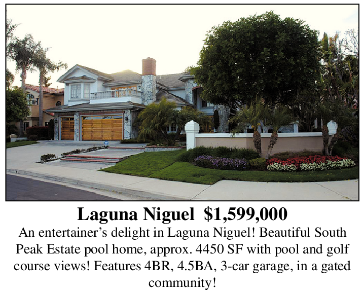 Laguna Niguel $1,599,000 An entertainer’s delight in Laguna Niguel! Beautiful South Peak Estate pool home, approx. 4450 SF with pool and golf course views! Features 4BR, 4.5BA, 3-car garage, in a gated community!