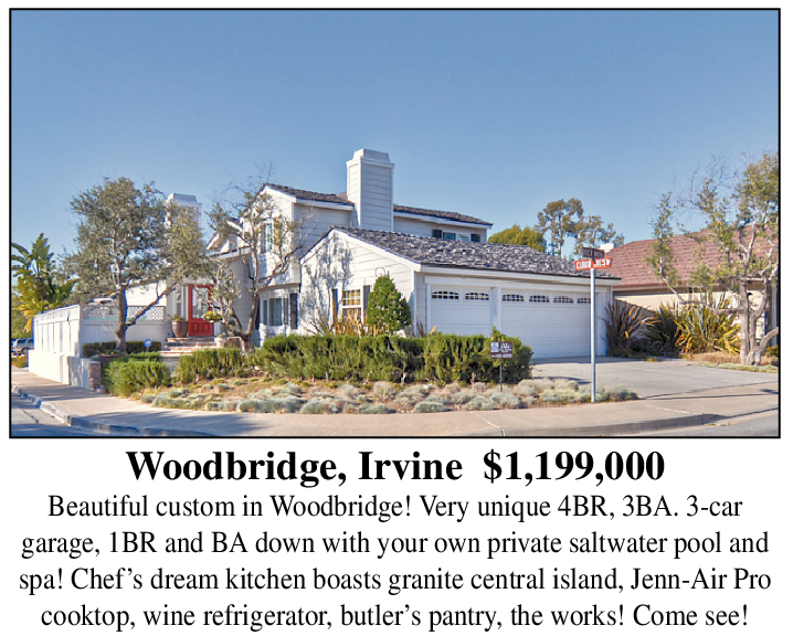 Woodbridge, Irvine $1,199,000 Beautiful custom in Woodbridge! Very unique 4BR, 3BA. 3-car garage, 1BR and BA down with your own private saltwater pool and spa! Chef’s dream kitchen boasts granite central island, Jenn-Air Pro cooktop, wine refrigerator, butler’s pantry, the works! Come see!