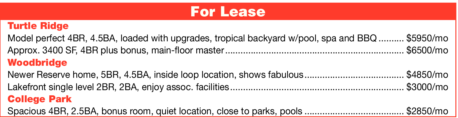 Turtle Ridge Model perfect 4BR, 4.5BA, loaded with upgrades, tropical backyard w/pool, spa and BBQ .......... $5950/mo Approx. 3400 SF, 4BR plus bonus, main-floor master ...................................................................... $6500/mo Woodbridge Newer Reserve home, 5BR, 4.5BA, inside loop location, shows fabulous ....................................... $4850/mo Lakefront single level 2BR, 2BA, enjoy assoc. facilities .................................................................... $3000/mo College Park Spacious 4BR, 2.5BA, bonus room, quiet location, close to parks, pools ....................................... $2850/mo