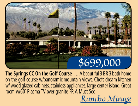 $699,000 The Springs CC On the Golf Course … A beautiful 3 BR 3 bath home on the golf course w/panoramic mountain views. Chefs dream kitchen w/ wood glazed cabinets, stainless appliances, large center island, Great room w/60’ Plasma TV over granite FP. A Must See! Rancho Mirage See also