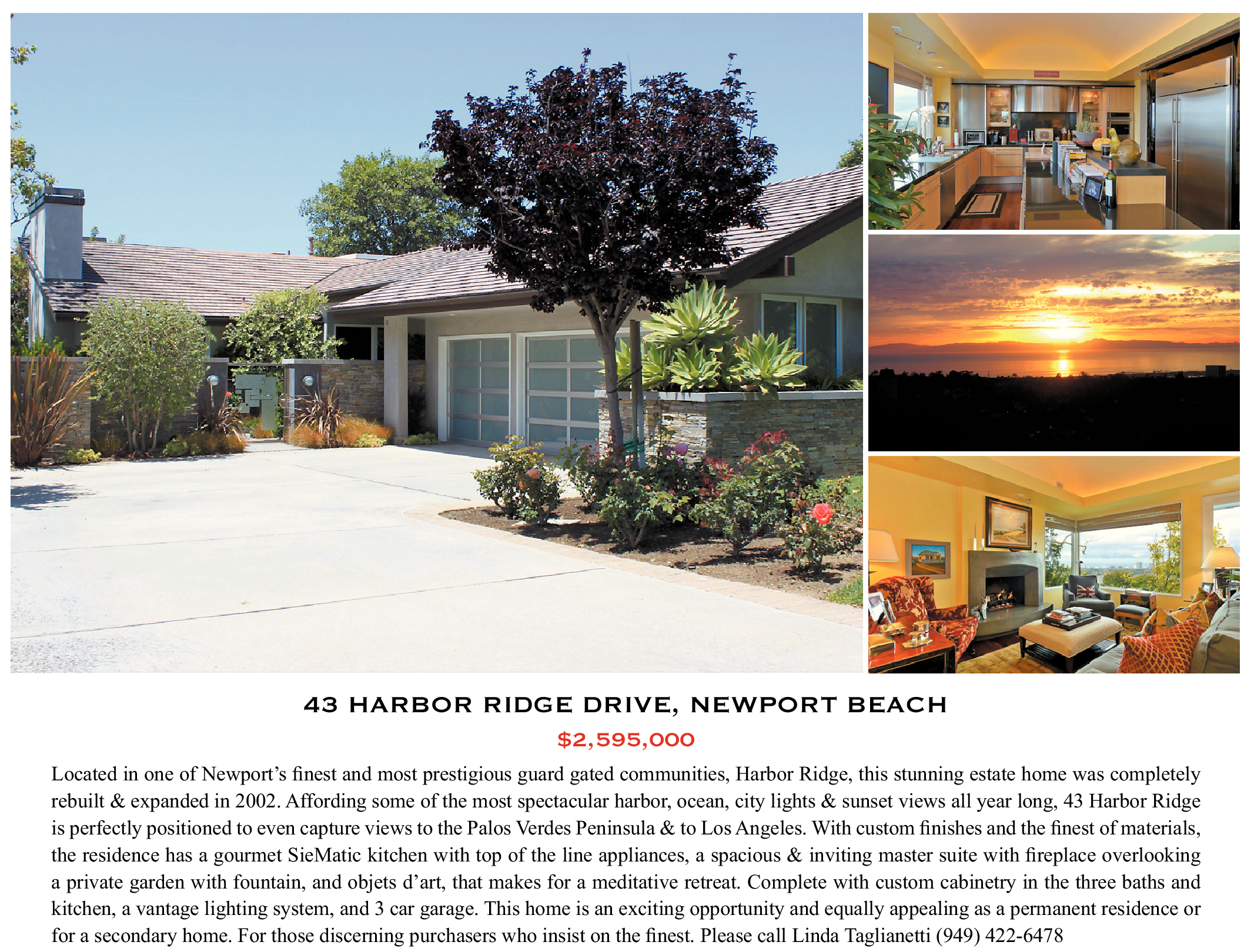 43 HARBOR RIDGE DRIVE, NEWPORT BEACH $2,595,000 Located in one of Newport’s finest and most prestigious guard gated communities, Harbor Ridge, this stunning estate home was completely rebuilt & expanded in 2002. Affording some of the most spectacular harbor, ocean, city lights & sunset views all year long, 43 Harbor Ridge is perfectly positioned to even capture views to the Palos Verdes Peninsula & to Los Angeles. With custom finishes and the finest of materials, the residence has a gourmet SieMatic kitchen with top of the line appliances, a spacious & inviting master suite with fireplace overlooking a private garden with fountain, and objets d’art, that makes for a meditative retreat. Complete with custom cabinetry in the three baths and kitchen, a vantage lighting system, and 3 car garage. This home is an exciting opportunity and equally appealing as a permanent residence or for a secondary home. For those discerning purchasers who insist on the finest. Please call Linda Taglianetti (949) 422-6478