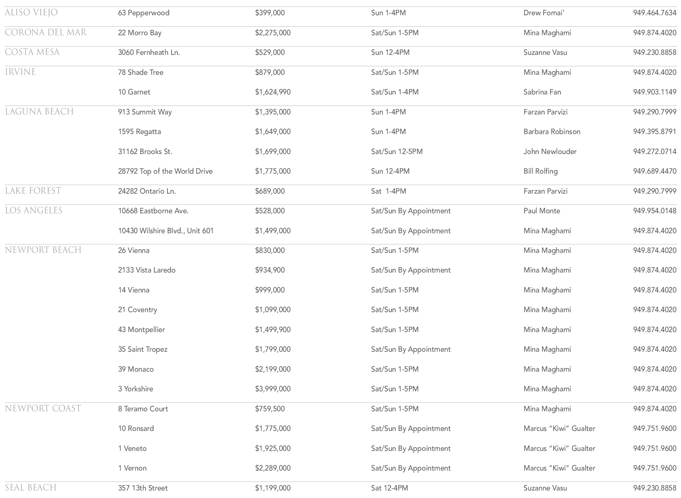 NEWPORT BEACH 26 Vienna $830,000 Sat/Sun 1-5PM Mina Maghami 949.874.4020