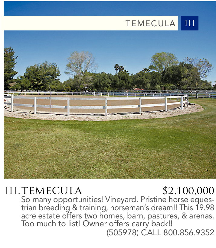 III. TEMECULA $2,100,000 So many opportunities! Vineyard. Pristine horse equestrian breeding & training, horseman’s dream!! This 19.98 acre estate offers two homes, barn, pastures, & arenas. Too much to list! Owner offers carry back!! (505978) CALL 800.856.9352 TEMECULA III