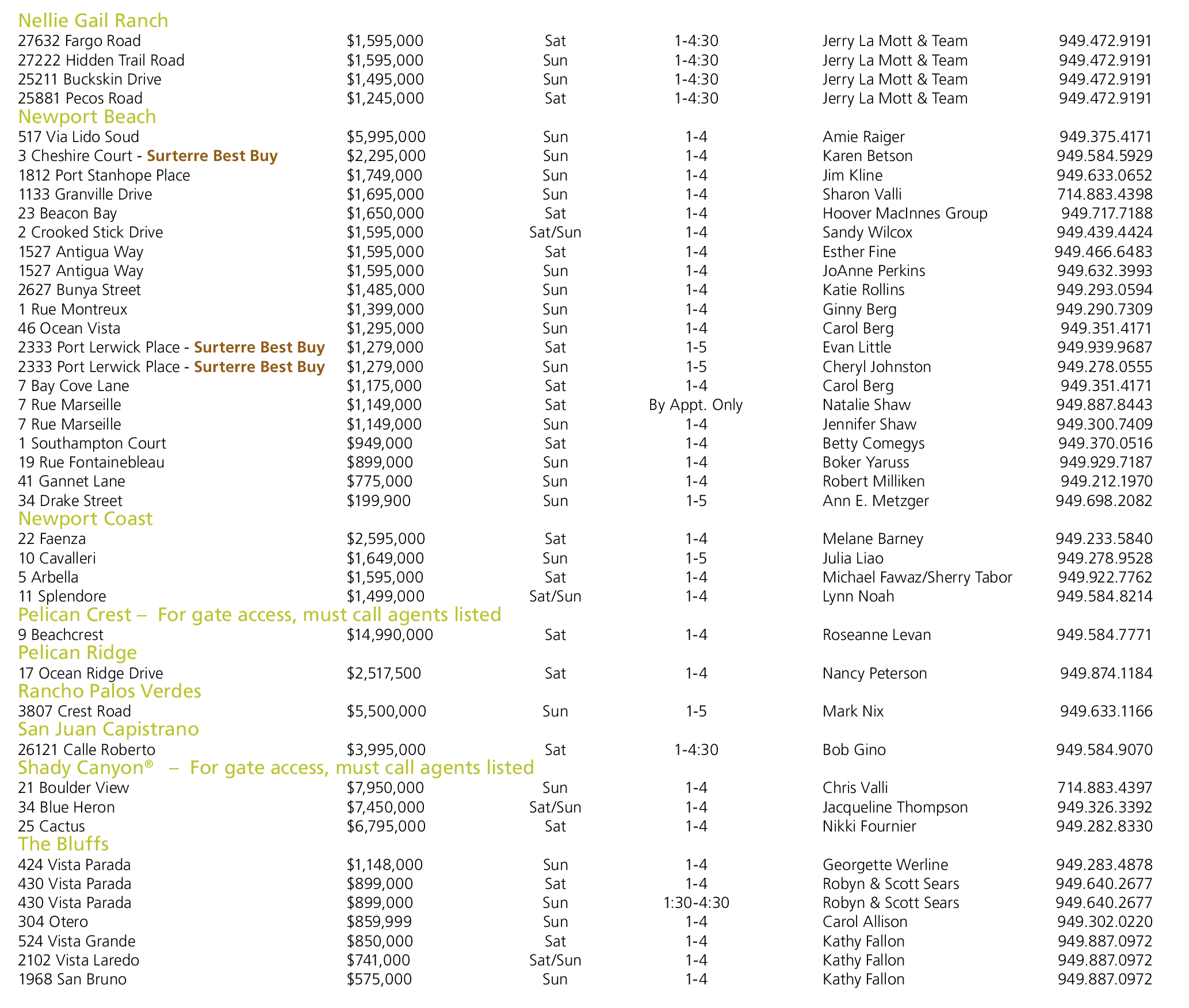 Nellie Gail Ranch 27632 Fargo Road $1,595,000 Sat 1-4:30 Jerry La Mott & Team 949.472.9191 27222 Hidden Trail Road $1,595,000 Sun 1-4:30 Jerry La Mott & Team 949.472.9191 25211 Buckskin Drive $1,495,000 Sun 1-4:30 Jerry La Mott & Team 949.472.9191 25881 Pecos Road $1,245,000 Sat 1-4:30 Jerry La Mott & Team 949.472.9191 Newport Beach 517 Via Lido Soud $5,995,000 Sun 1-4 Amie Raiger 949.375.4171 3 Cheshire Court - Surterre Best Buy $2,295,000 Sun 1-4 Karen Betson 949.584.5929 1812 Port Stanhope Place $1,749,000 Sun 1-4 Jim Kline 949.633.0652 1133 Granville Drive $1,695,000 Sun 1-4 Sharon Valli 714.883.4398 23 Beacon Bay $1,650,000 Sat 1-4 Hoover MacInnes Group 949.717.7188 2 Crooked Stick Drive $1,595,000 Sat/Sun 1-4 Sandy Wilcox 949.439.4424 1527 Antigua Way $1,595,000 Sat 1-4 Esther Fine 949.466.6483 1527 Antigua Way $1,595,000 Sun 1-4 JoAnne Perkins 949.632.3993 2627 Bunya Street $1,485,000 Sun 1-4 Katie Rollins 949.293.0594 1 Rue Montreux $1,399,000 Sun 1-4 Ginny Berg 949.290.7309 46 Ocean Vista $1,295,000 Sun 1-4 Carol Berg 949.351.4171 2333 Port Lerwick Place - Surterre Best Buy $1,279,000 Sat 1-5 Evan Little 949.939.9687 2333 Port Lerwick Place - Surterre Best Buy $1,279,000 Sun 1-5 Cheryl Johnston 949.278.0555 7 Bay Cove Lane $1,175,000 Sat 1-4 Carol Berg 949.351.4171 7 Rue Marseille $1,149,000 Sat By Appt. Only Natalie Shaw 949.887.8443 7 Rue Marseille $1,149,000 Sun 1-4 Jennifer Shaw 949.300.7409 1 Southampton Court $949,000 Sat 1-4 Betty Comegys 949.370.0516 19 Rue Fontainebleau $899,000 Sun 1-4 Boker Yaruss 949.929.7187 41 Gannet Lane $775,000 Sun 1-4 Robert Milliken 949.212.1970 34 Drake Street $199,900 Sun 1-5 Ann E. Metzger 949.698.2082 Newport Coast 22 Faenza $2,595,000 Sat 1-4 Melane Barney 949.233.5840 10 Cavalleri $1,649,000 Sun 1-5 Julia Liao 949.278.9528 5 Arbella $1,595,000 Sat 1-4 Michael Fawaz/Sherry Tabor 949.922.7762 11 Splendore $1,499,000 Sat/Sun 1-4 Lynn Noah 949.584.8214 Pelican Crest – For gate access, must call agents listed 9 Beachcrest $14,990,000 Sat 1-4 Roseanne Levan 949.584.7771 Pelican Ridge 17 Ocean Ridge Drive $2,517,500 Sat 1-4 Nancy Peterson 949.874.1184 Rancho Palos Verdes 3807 Crest Road $5,500,000 Sun 1-5 Mark Nix 949.633.1166 San Juan Capistrano 26121 Calle Roberto $3,995,000 Sat 1-4:30 Bob Gino 949.584.9070 Shady Canyon ® – For gate access, must call agents listed 21 Boulder View $7,950,000 Sun 1-4 Chris Valli 714.883.4397 34 Blue Heron $7,450,000 Sat/Sun 1-4 Jacqueline Thompson 949.326.3392 25 Cactus $6,795,000 Sat 1-4 Nikki Fournier 949.282.8330 The Bluffs 424 Vista Parada $1,148,000 Sun 1-4 Georgette Werline 949.283.4878 430 Vista Parada $899,000 Sat 1-4 Robyn & Scott Sears 949.640.2677 430 Vista Parada $899,000 Sun 1:30-4:30 Robyn & Scott Sears 949.640.2677 304 Otero $859,999 Sun 1-4 Carol Allison 949.302.0220 524 Vista Grande $850,000 Sat 1-4 Kathy Fallon 949.887.0972 2102 Vista Laredo $741,000 Sat/Sun 1-4 Kathy Fallon 949.887.0972 1968 San Bruno $575,000 Sun 1-4 Kathy Fallon 949.887.0972