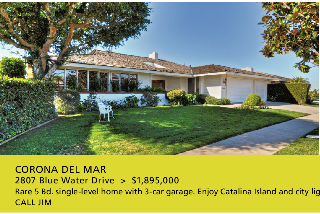 CORONA DEL MAR 2807 Blue Water Drive > $1,895,000 Rare 5 Bd. single-level home with 3-car garage. Enjoy Catalina Island and city light CALL JIM