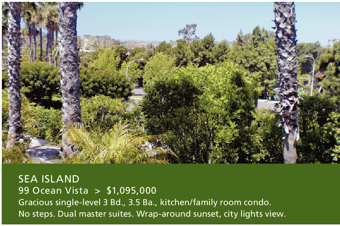 SEA ISLAND 99 Ocean Vista > $1,095,000 Gracious single-level 3 Bd., 3.5 Ba., kitchen/family room condo. No steps. Dual master suites. Wrap-around sunset, city lights view.