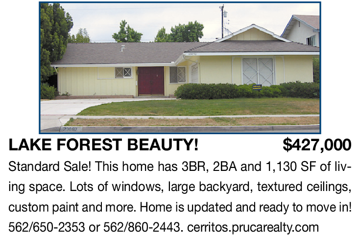 LAKE FOREST BEAUTY! $427,000 Standard Sale! This home has 3BR, 2BA and 1,130 SF of living space. Lots of windows, large backyard, textured ceilings, custom paint and more. Home is updated and ready to move in! 562/650-2353 or 562/860-2443. cerritos.prucarealty.com