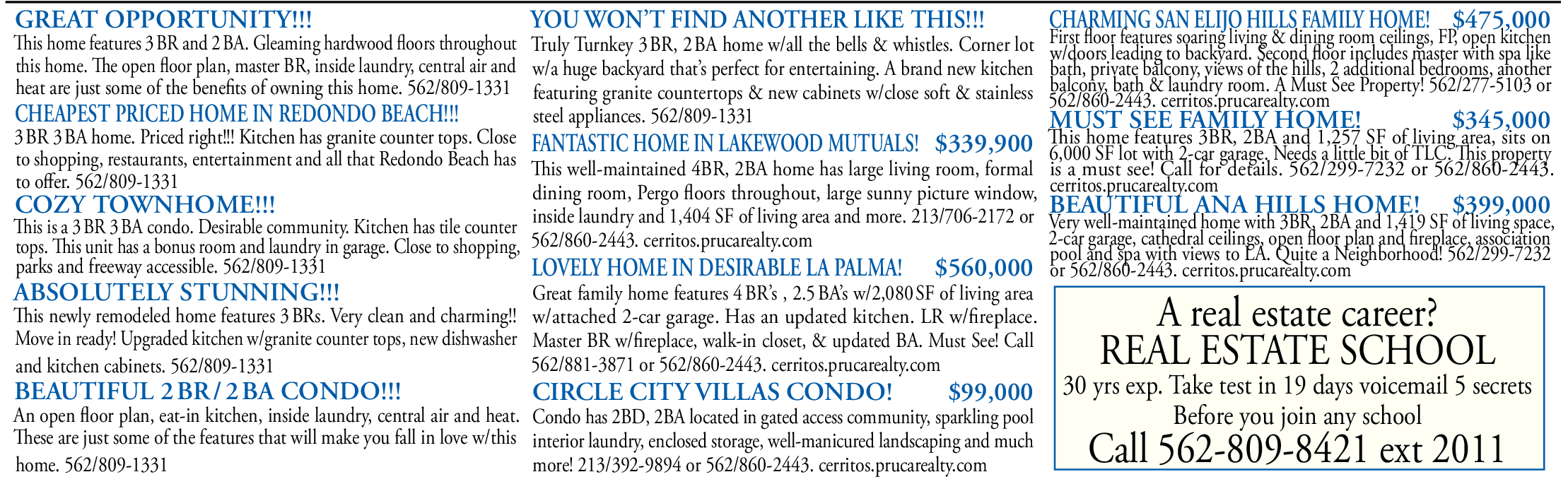 YOU WON’T FIND ANOTHER LIKE THIS!!! Truly Turnkey 3 BR, 2 BA home w/all the bells & whistles. Corner lot w/a huge backyard that’s perfect for entertaining. A brand new kitchen featuring granite countertops & new cabinets w/close soft & stainless steel appliances. 562/809-1331 FANTASTIC HOME IN LAKEWOOD MUTUALS! $339,900 This well-maintained 4BR, 2BA home has large living room, formal dining room, Pergo floors throughout, large sunny picture window, inside laundry and 1,404 SF of living area and more. 213/706-2172 or 562/860-2443. cerritos.prucarealty.com LOVELY HOME IN DESIRABLE LA PALMA! $560,000 Great family home features 4 BR’s , 2.5 BA’s w/2,080 SF of living area w/attached 2-car garage. Has an updated kitchen. LR w/fireplace. Master BR w/fireplace, walk-in closet, & updated BA. Must See! Call 562/881-3871 or 562/860-2443. cerritos.prucarealty.com CIRCLE CITY VILLAS CONDO! $99,000 Condo has 2BD, 2BA located in gated access community, sparkling pool interior laundry, enclosed storage, well-manicured landscaping and much more! 213/392-9894 or 562/860-2443. cerritos.prucarealty.com