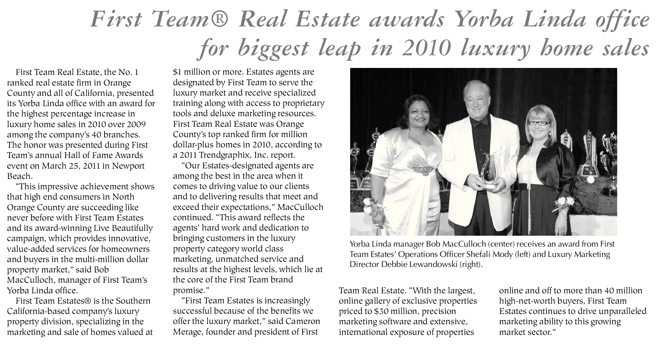 First Team Real Estate, the No. 1 ranked real estate firm in Orange County and all of California, presented its Yorba Linda office with an award for the highest percentage increase in luxury home sales in 2010 over 2009 among the company’s 40 branches. The honor was presented during First Team’s annual Hall of Fame Awards event on March 25, 2011 in Newport Beach.