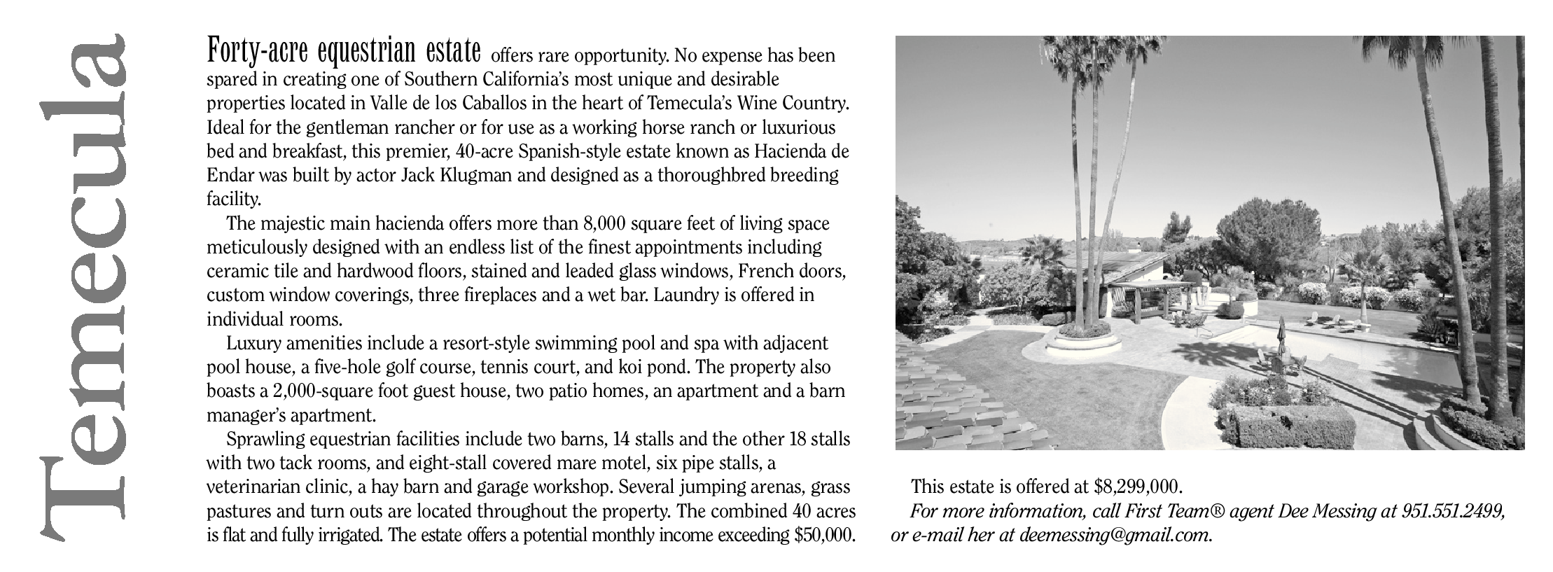offers rare opportunity. No expense has been spared in creating one of Southern California’s most unique and desirable properties located in Valle de los Caballos in the heart of Temecula’s Wine Country. Ideal for the gentleman rancher or for use as a working horse ranch or luxurious bed and breakfast, this premier, 40-acre Spanish-style estate known as Hacienda de Endar was built by actor Jack Klugman and designed as a thoroughbred breeding facility.