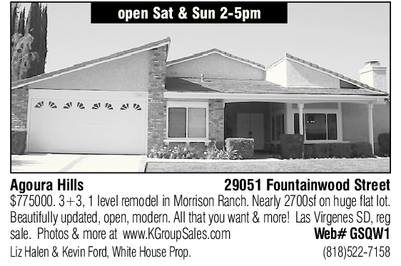 open Sat & Sun 2-5pm Agoura Hills 29051 Fountainwood Street $775000. 3+3, 1 level remodel in Morrison Ranch. Nearly 2700sf on huge flat lot. Beautifully updated, open, modern. All that you want & more! Las Virgenes SD, reg sale. Photos & more at www.KGroupSales.com Web# GSQW1 Liz Halen & Kevin Ford, White House Prop. (818)522-7158