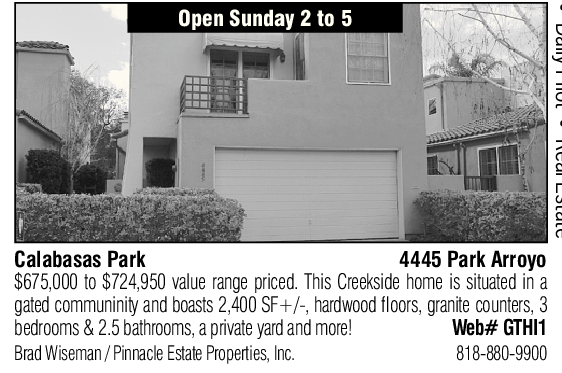 Calabasas Park 4445 Park Arroyo $675,000 to $724,950 value range priced. This Creekside home is situated in a gated communinity and boasts 2,400 SF+/-, hardwood floors, granite counters, 3 bedrooms & 2.5 bathrooms, a private yard and more! Web# GTHI1 Brad Wiseman / Pinnacle Estate Properties, Inc. 818-880-9900