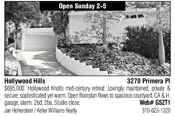 Open Sunday 2-5 Hollywood Hills 3270 Primera Pl $695,000. Hollywood Knolls mid-century retreat. Lovingly maintained, private & secure, sophisticated yet warm. Open floorplan flows to spacious courtyard. CA & H, garage, alarm. 2bd, 2ba. Studio close. Web# GSZT1 Jan Hohenstein / Keller Williams Realty 310-623-1320 See also