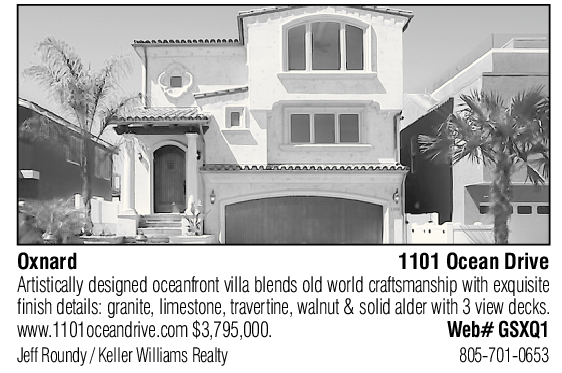 Oxnard 1101 Ocean Drive Artistically designed oceanfront villa blends old world craftsmanship with exquisite finish details: granite, limestone, travertine, walnut & solid alder with 3 view decks. www.1101oceandrive.com $3,795,000. Web# GSXQ1 Jeff Roundy / Keller Williams Realty 805-701-0653