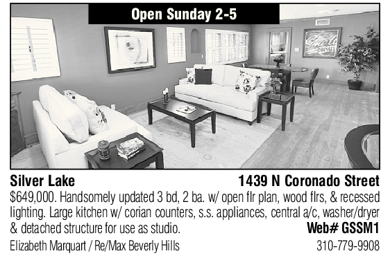 Open Sunday 2-5 Silver Lake 1439 N Coronado Street $649,000. Handsomely updated 3 bd, 2 ba. w/ open flr plan, wood flrs, & recessed lighting. Large kitchen w/ corian counters, s.s. appliances, central a/c, washer/dryer & detached structure for use as studio. Web# GSSM1 Elizabeth Marquart / Re/Max Beverly Hills 310-779-9908 See also