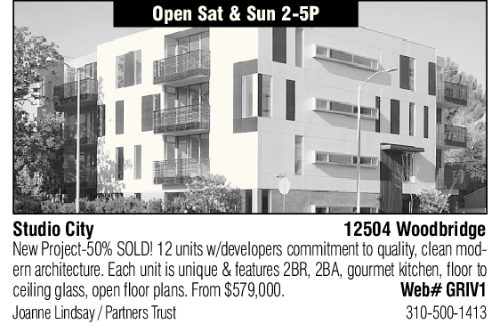 Open Sat & Sun 2-5P Studio City 12504 Woodbridge New Project-50% SOLD! 12 units w/developers commitment to quality, clean modern architecture. Each unit is unique & features 2BR, 2BA, gourmet kitchen, floor to ceiling glass, open floor plans. From $579,000. Web# GRIV1 Joanne Lindsay / Partners Trust 310-500-1413
