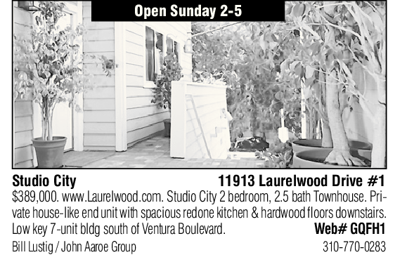 Open Sunday 2-5 Studio City 11913 Laurelwood Drive #1 vate house-like end unit with spacious redone kitchen & hardwood floors downstairs. $389,000. www.Laurelwood.com. Studio City 2 bedroom, 2.5 bath Townhouse. Pri- Low key 7-unit bldg south of Ventura Boulevard. Web# GQFH1 Bill Lustig / John Aaroe Group 310-770-0283 See also